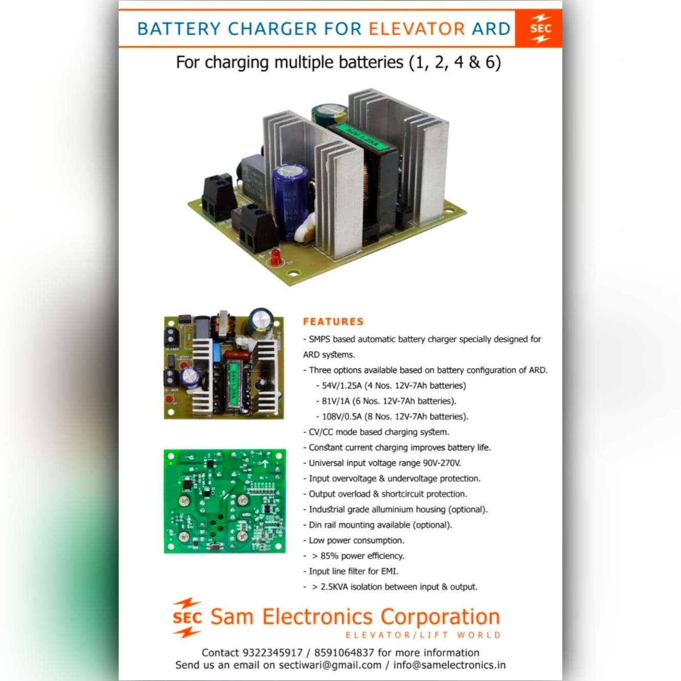 SAM Electronics Corporation, Mumbai, is a trusted manufacturer of high-quality Battery Chargers for Elevator ARD (Automatic Rescue Device) systems. Our ARD battery chargers are specially designed to ensure uninterrupted power supply during power failures, enabling elevators to safely move passengers to the nearest floor and open doors. Built with advanced technology, our chargers provide fast charging, stable output, overload protection, and long battery life, ensuring maximum reliability and safety. We focus on precision engineering, robust components, and strict quality control to meet the demanding requirements of modern elevator systems. SAM Electronics Corporation manufactures battery chargers that are energy-efficient, low-maintenance, and compatible with various elevator ARD models. Our products are widely used in residential, commercial, and industrial buildings across Mumbai and other regions. With a commitment to safety, performance, and customer satisfaction, SAM Electronics Corporation continues to be a dependable name in elevator ARD battery charger manufacturing, delivering reliable solutions that enhance passenger safety and elevator efficiency.